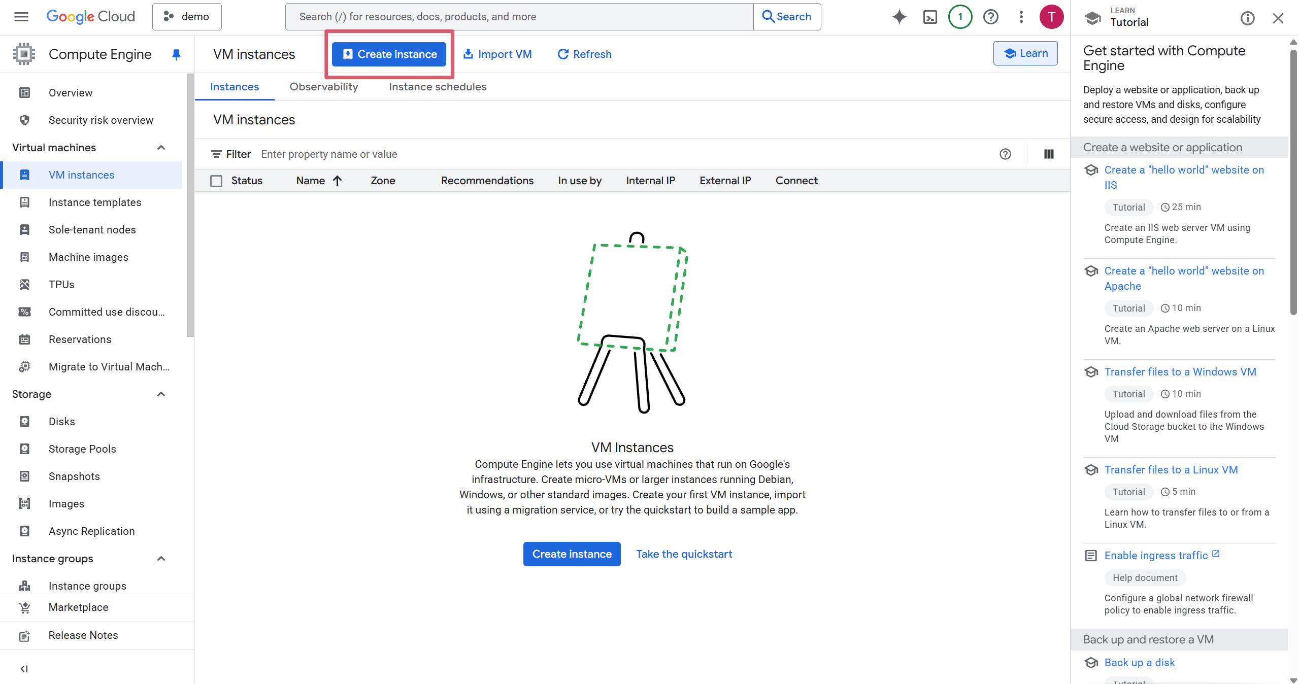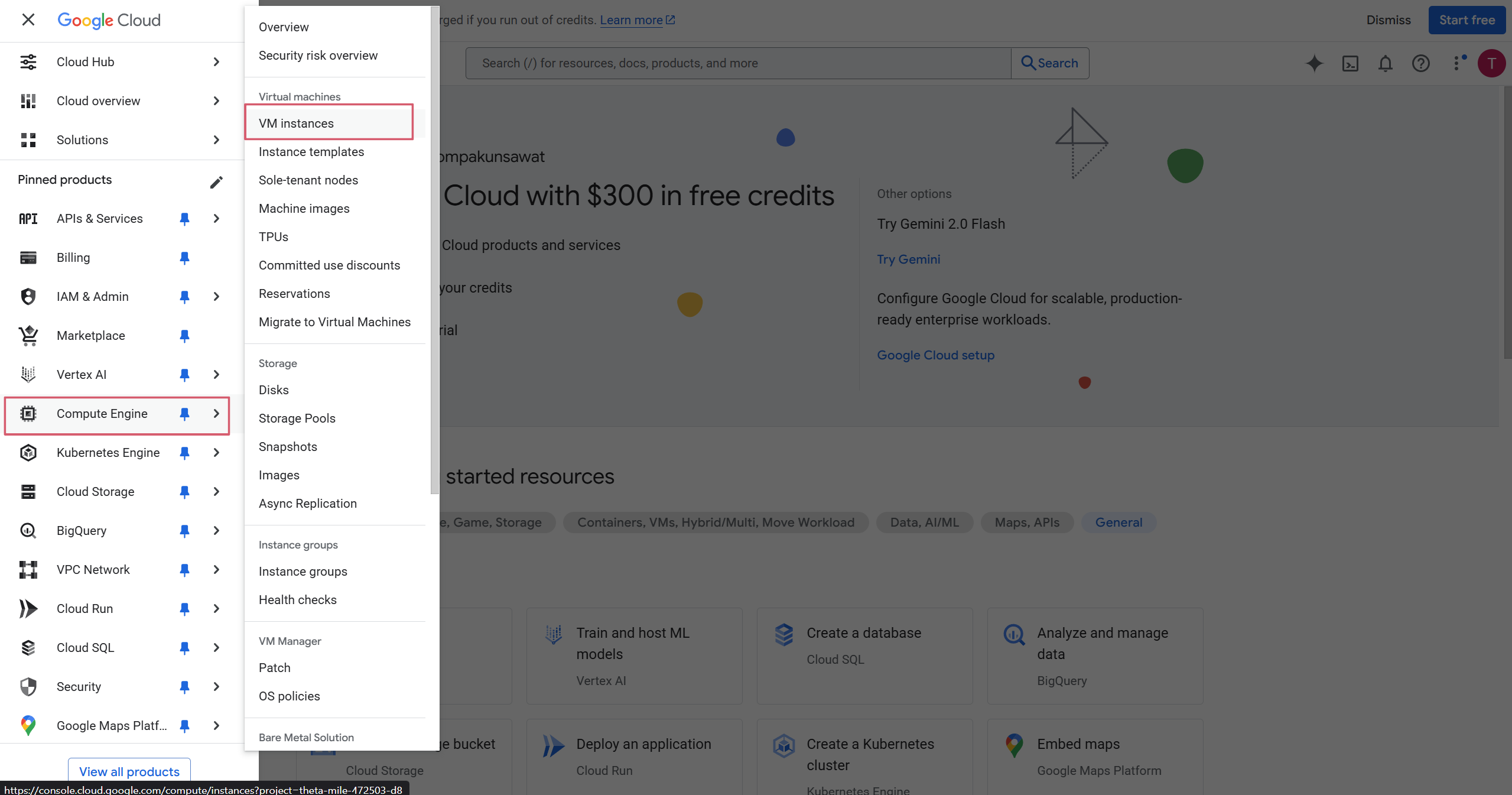 เมื่อเลือกโปรเจกต์แล้วให้เรากดปุ่มเมนูที่ฝั่งซ้ายด้านบน แล้วให้เราเลือกไปที่ Compute Engine และ VM instances