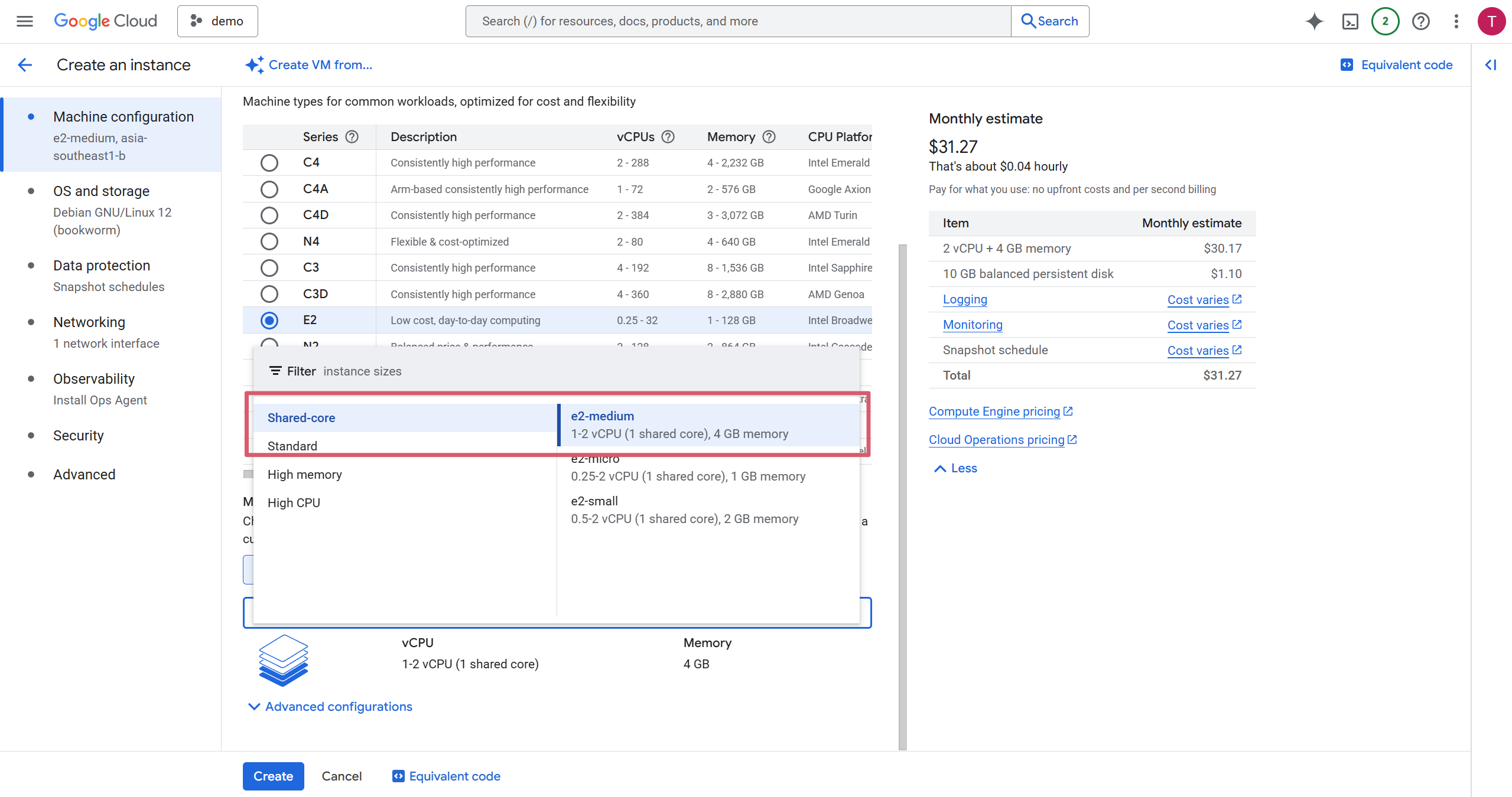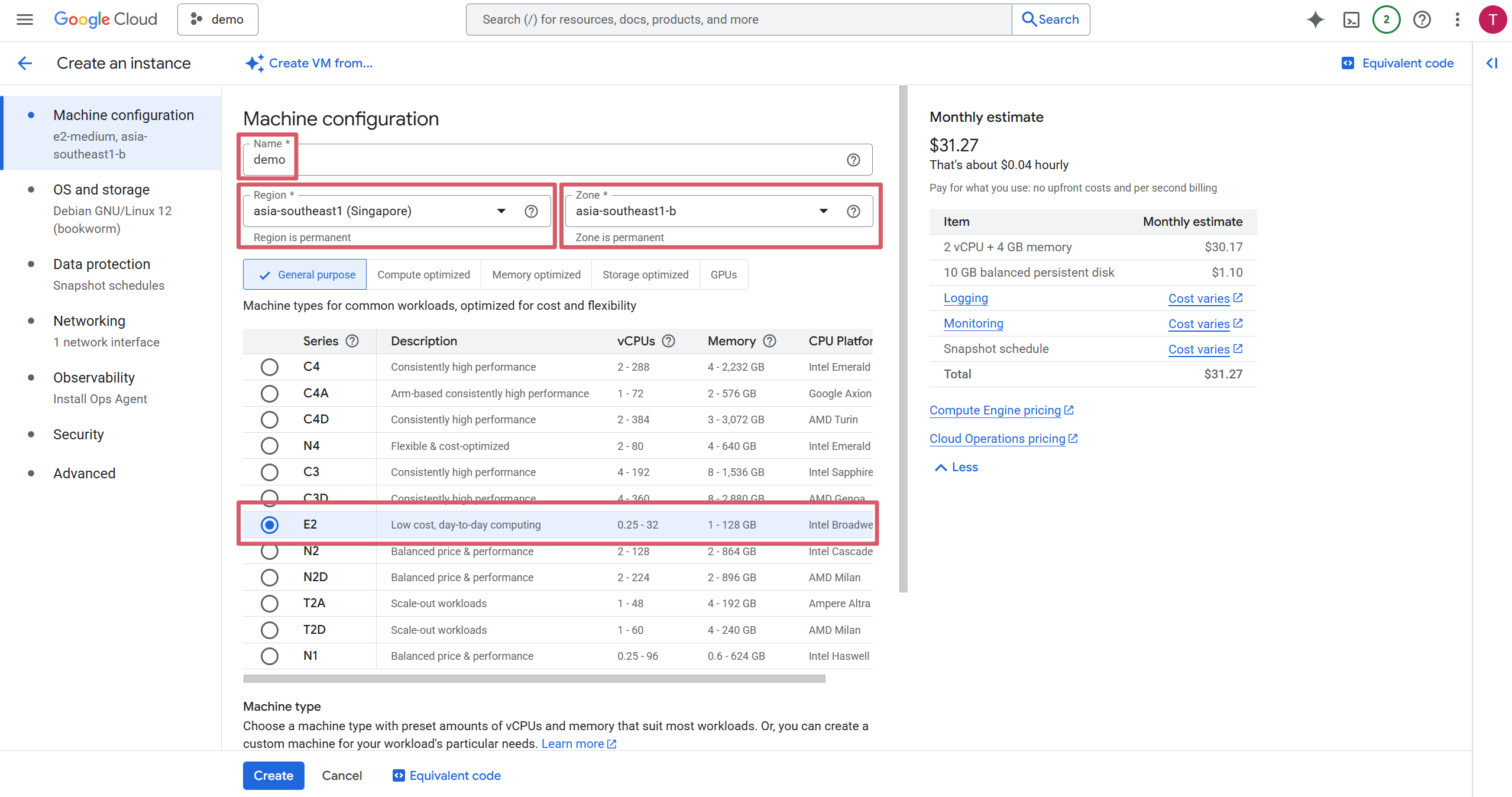 เราจะมาเริ่ม set up เครื่อง VM ของเรากัน โดยที่ผมจะเลือกแบบที่ราคาต่ำสุด เพราะนี่เป็นเพียงการ demo เท่านั้น อย่างแรกเลยเราจะตั้งชื่อเครื่องให้มัน ซึ่งผมจะตั้งชื่อเดียวกับชื่อโปรเจกต์ ซึ่งก็คือ demo เพื่อผมจะได้จำได้ง่าย ในส่วนของ region ผมจะเลือกเป็น asia-southeast1 (Singapore) ส่วน Zone ผมจะเลือกเป็น asia-southeast1-b และ Series ผมจะเลือกเป็น E2 เพราะราคามันถูกสุด