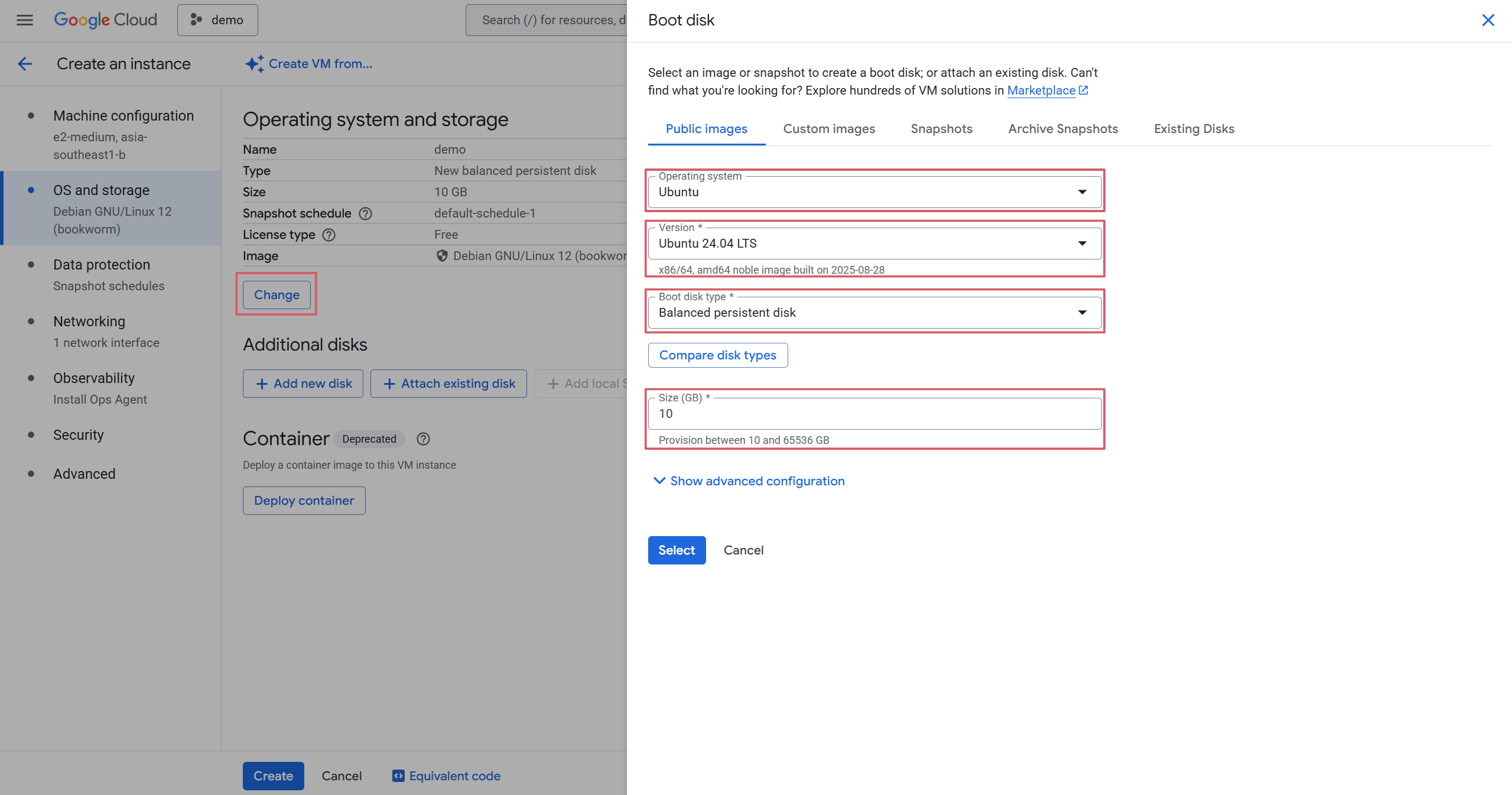 ในแท็ปต่อมา OS and storage ให้เรากดไปที่ปุ่ม Change และเลือก Operating System เป็น Ubuntu, Version เป็น Ubuntu 24.04 LTS x86/64, amd64, Boot disk type เป็น Balanced persistent disk, Size เป็น 10 GB และจึงกด Select