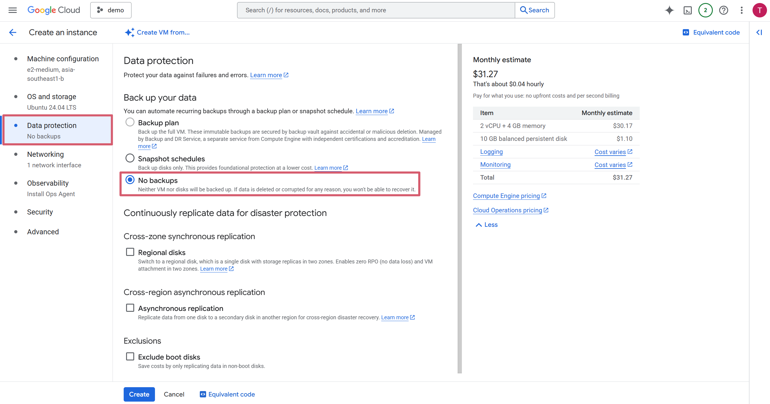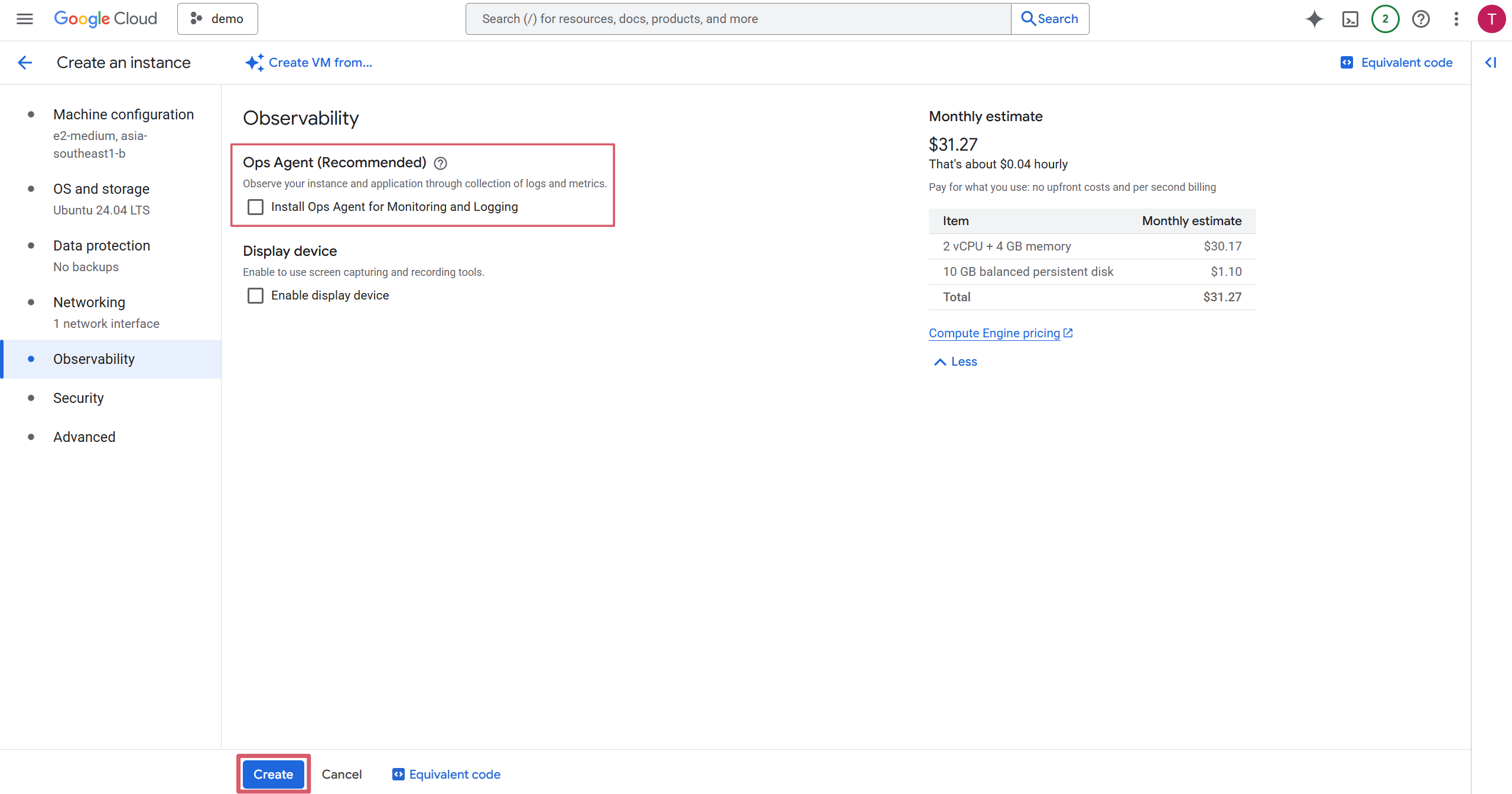 สุดท้าย ในแท็ป observability ผมจะ disable Ops Agent ด้วยเหตุผลเดิม เผื่อที่จะประหยัดงบประมาณ เพราะนี่เป็นเพียง demo project. อีกสองแท็ปข้างล่าง(Security และ Advanced) เราจะยังไม่ได้ไปยุ่งกับมันใน Tutorial นี้ ให้เรากดปุ่ม Create ด้านล่างเผื่อสร้าง VM เครื่องแรกของเราได้เลย!