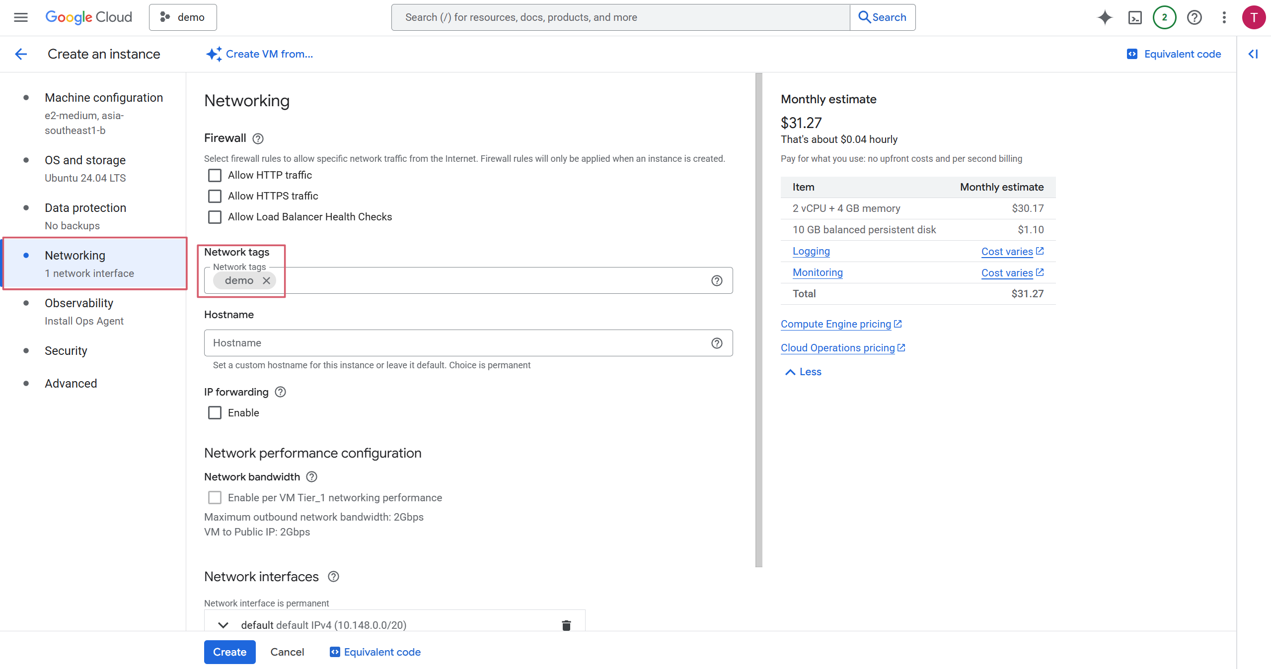 ในแท็ป Networking ผมจะเพิ่ม Network tags เป็น demo ให้เหมือนชื่อโปรเจกต์