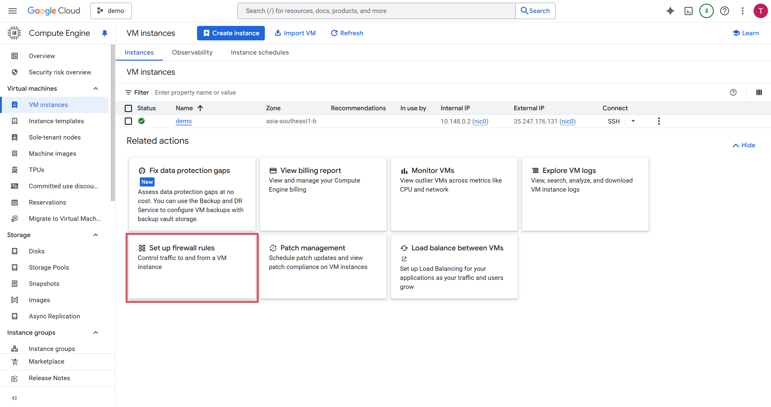 หลังจากที่เราได้สร้างเครื่อง VM ของเราแล้ว เราจะต้องมา set up firewall rules กัน เราจะกดเข้าไปที่การ์ด Set up firewall rules ด้านล่าง (หากใครไม่เจอสามารถค้นหาได้ใน search bar) หลังจากนั้นให้เรากดไปที่ปุ่ม Create firewall rules ด้านบน