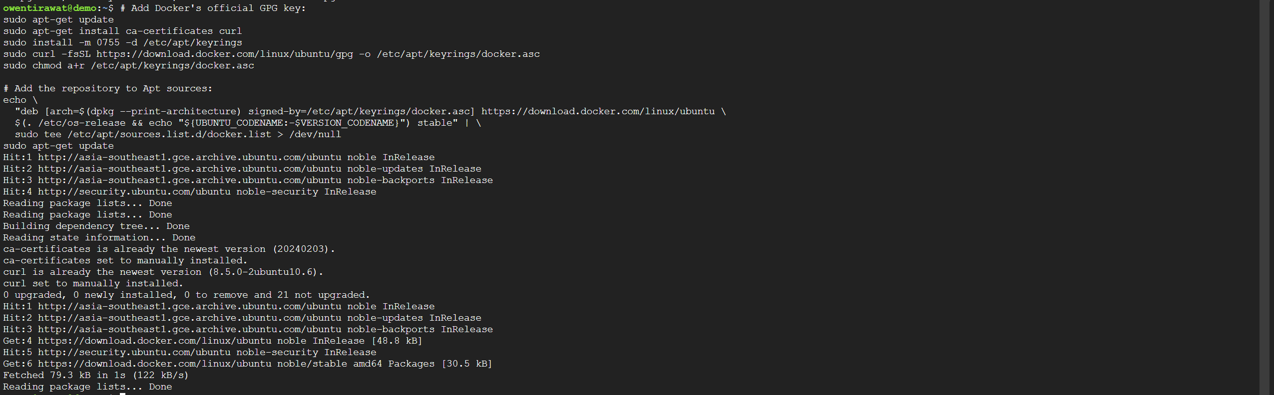 # Add Docker's official GPG key:sudo apt-get updatesudo apt-get install ca-certificates curlsudo install -m 0755 -d /etc/apt/keyringssudo curl -fsSL https://download.docker.com/linux/ubuntu/gpg -o /etc/apt/keyrings/docker.asc sudo chmod a+r /etc/apt/keyrings/docker.asc