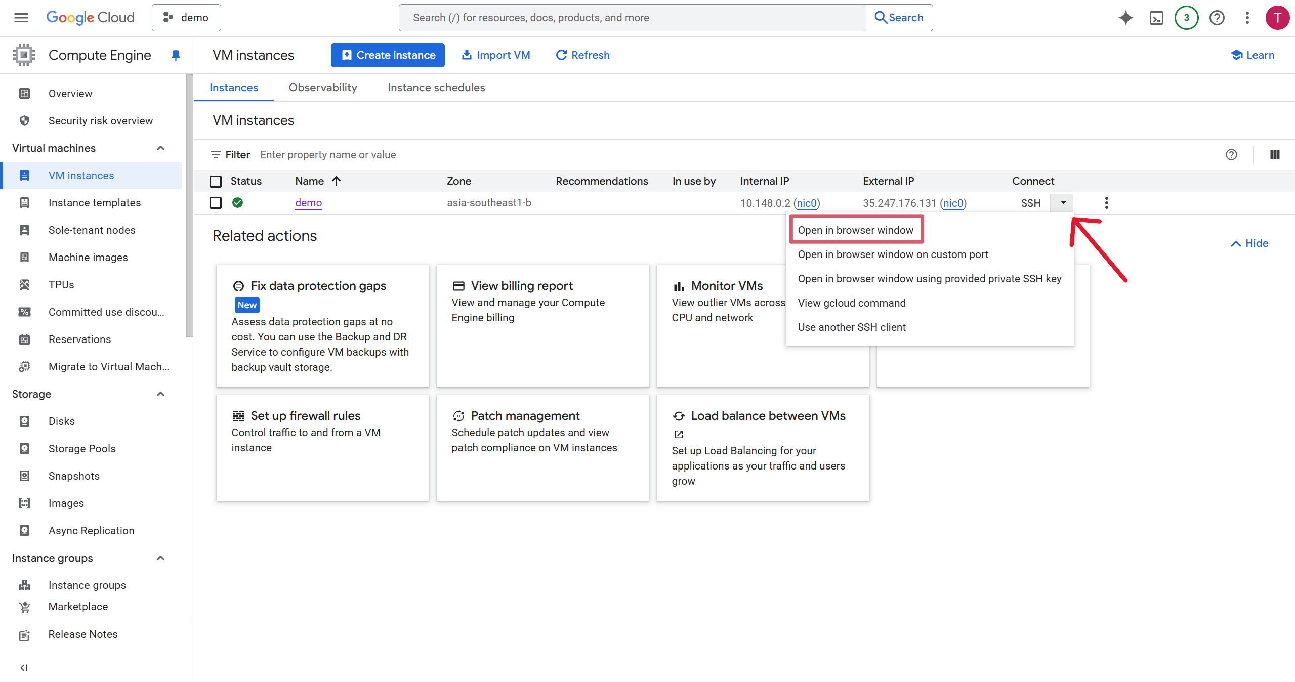 ให้เรามาที่หน้า VM instances และกดไปที่่ drop down menu ของเครื่อง VM ที่เราพึ่งสร้างไป และกด Open in browser window