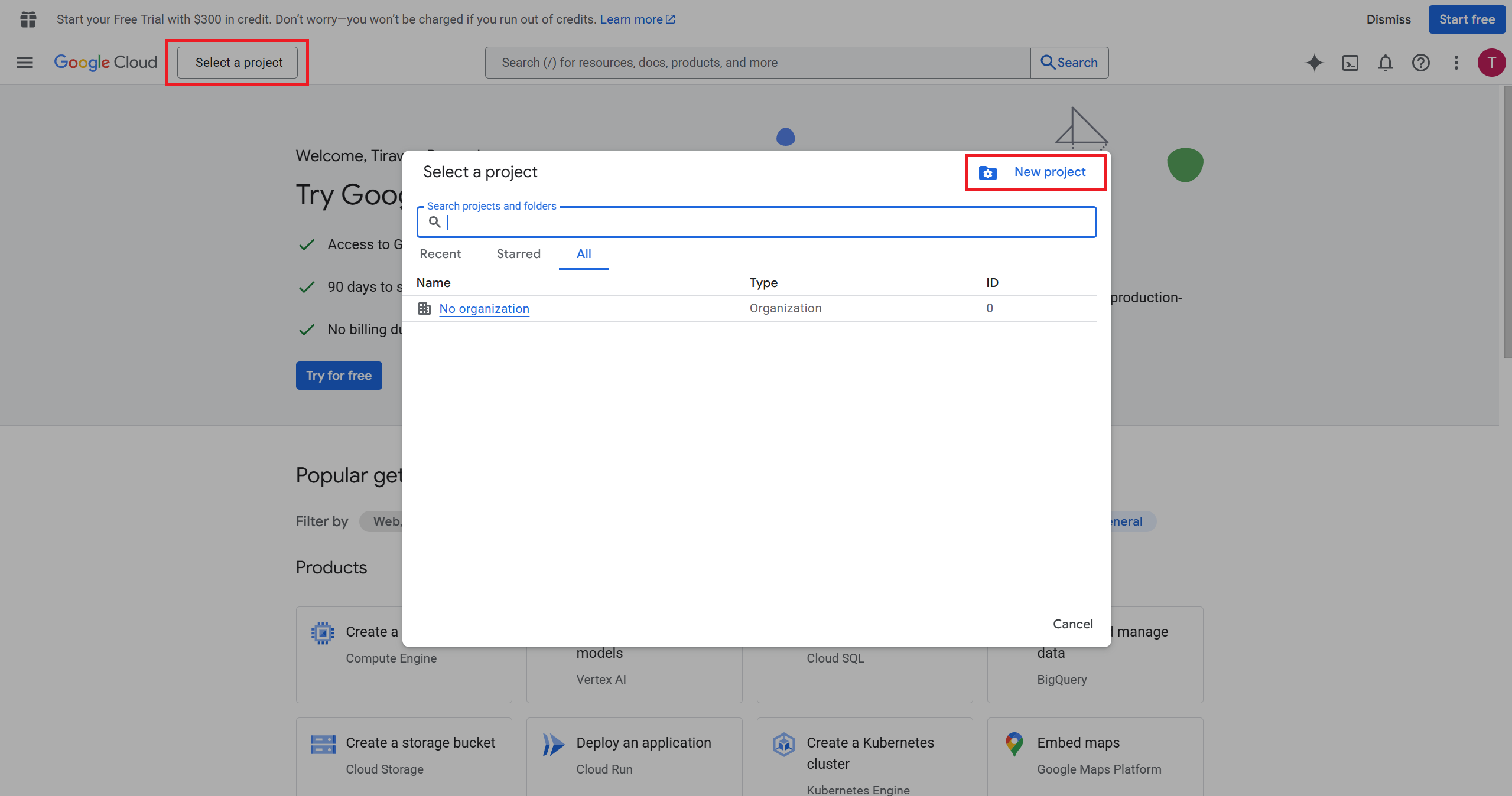 หากพึ่งเคยสมัครครั้งแรกเราจะได้รับ credit ฟรี $300 ด้วยนะ เมื่อเรา login หรือ signup สำเร็จแล้ว เราจะมาสร้างโปรเจกต์ใหม่กัน โดยกดไปที่ Select a project และ New project และให้เราเติม Project name เข้าไปโดยผมจะขอตั้งชื่อโปรเจกต์นี้ว่า demo และจึงกดปุ่ม Create เพื่อสร้างโปรเจกต์ หลังจากนั้นจึงกดที่ปุ่ม Select a project เพื่อเลือกโปรเจกต์ที่เราพึ่งสร้างไป