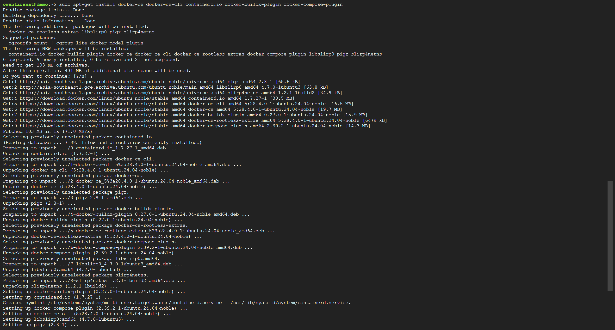 sudo apt-get install docker-ce docker-ce-cli containerd.io docker-buildx-plugin docker-compose-plugin