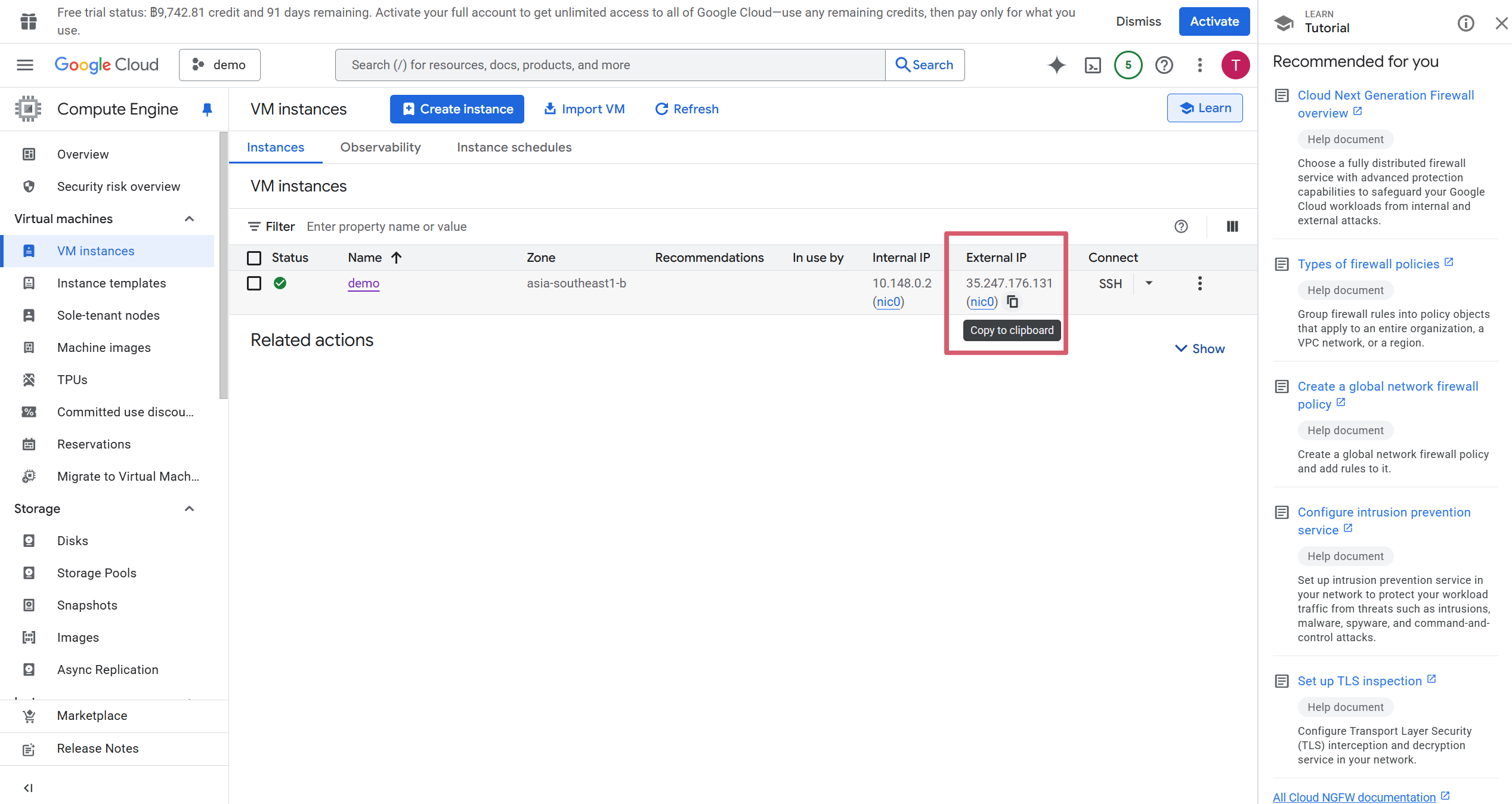 หลังจากนั้นให้เรากลับมาที่ Google Cloud ในหน้า VM instances อีกครั้งเพื่อที่จะ copy External IP ไปใส่ใน domain บน Duck DNS
