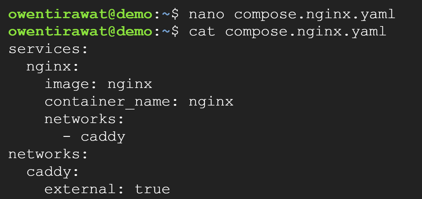 services: nginx: image: nginx container_name: nginx networks: - caddynetworks: caddy: external: true