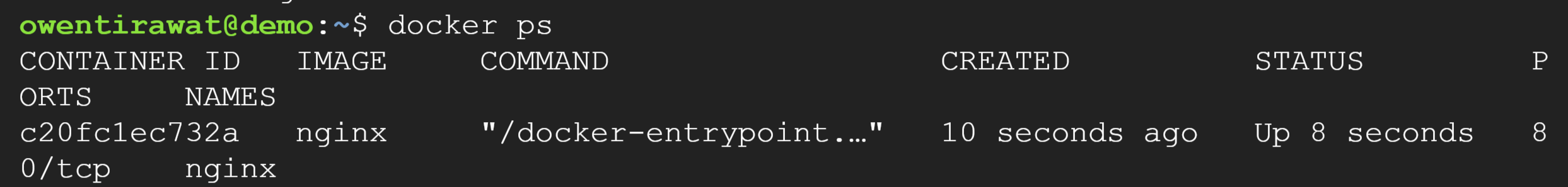 เราสามารถตรวจสอบว่า container ของ Nginx ทำงานอยู่หรือยัง ด้วยคำสั่งนี้