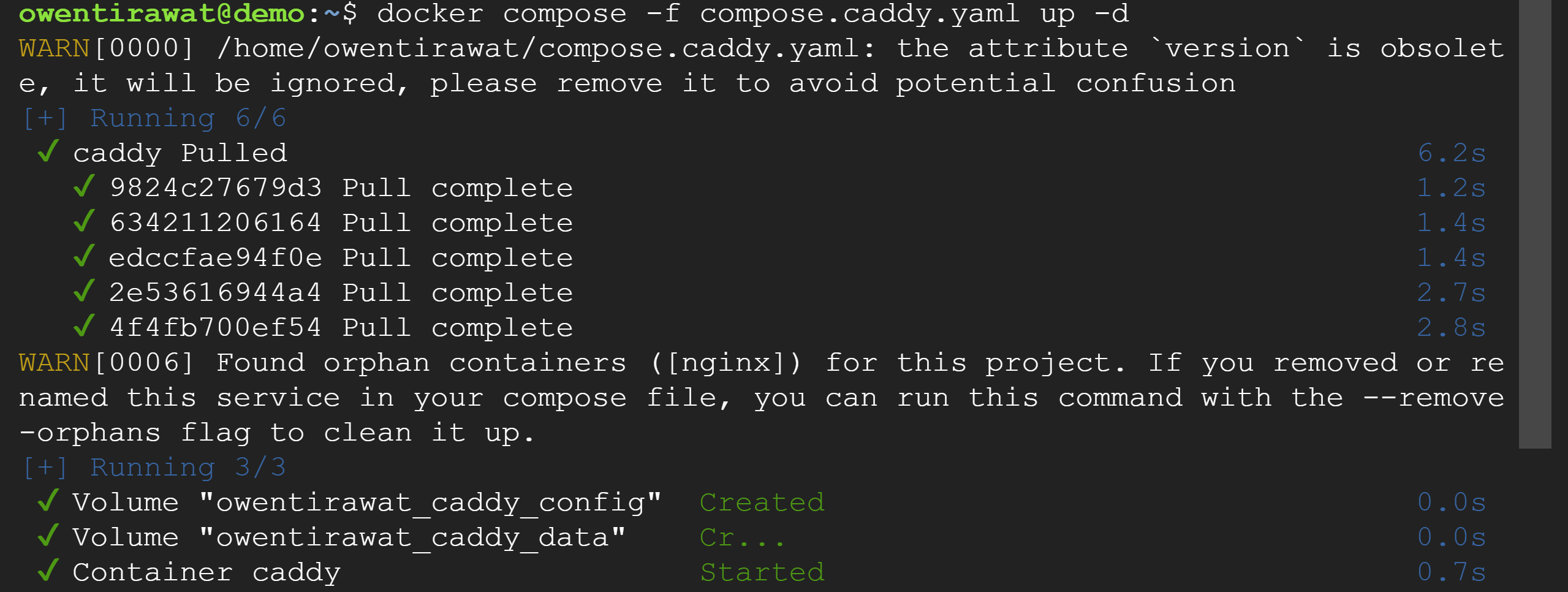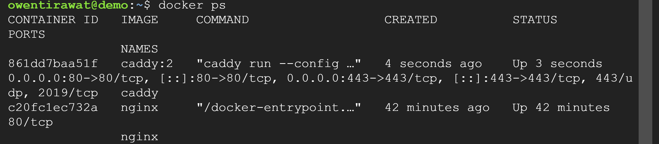 จะสังเกตุได้ว่าตอนนี้เราได้มี container สองอันที่กำลังรันอยู่แล้ว ก็คือ nginx และ caddy