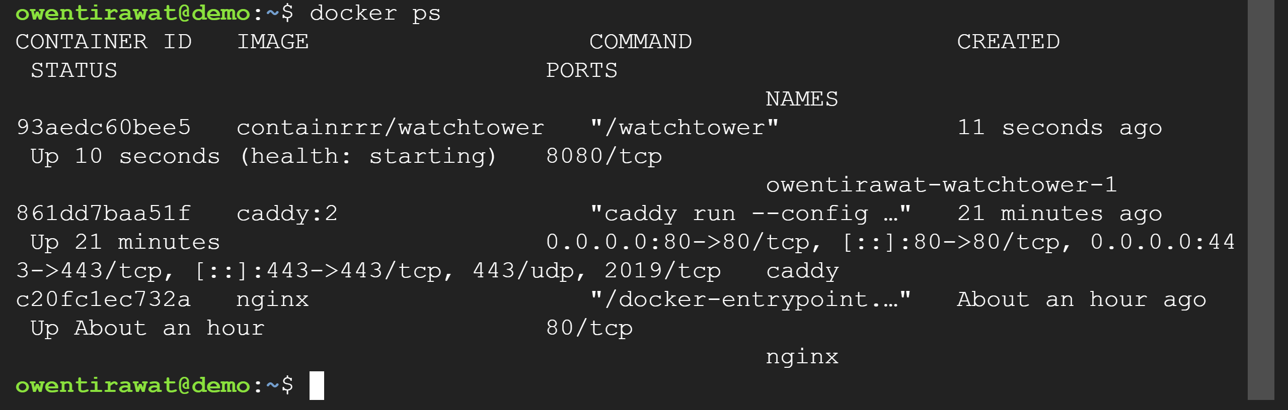 จะเห็นได้ว่าตอนนี้เรามี 3 container ที่กำลังทำงานอยู่แล้วคือ Nginx, Caddy และ Watchtower