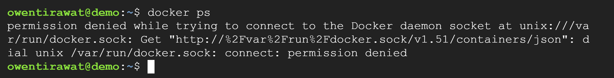 คุณจะเห็นว่ามันจะขึ้น error ว่า permission denied ซึ่งหมายความว่าผู้ใช้ปัจจุบันของเราไม่มีสิทธิ์เข้าถึง Docker daemon โดยตรง