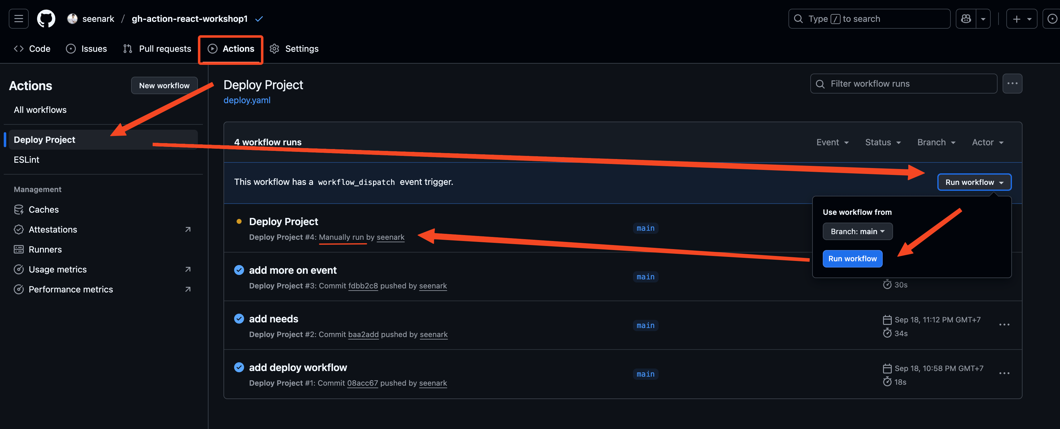ดูที่เฉพาะ deploy workflow จะเห็นว่ามีปุ่มให้เรากด Run แบบ manual อยู่ด้วย