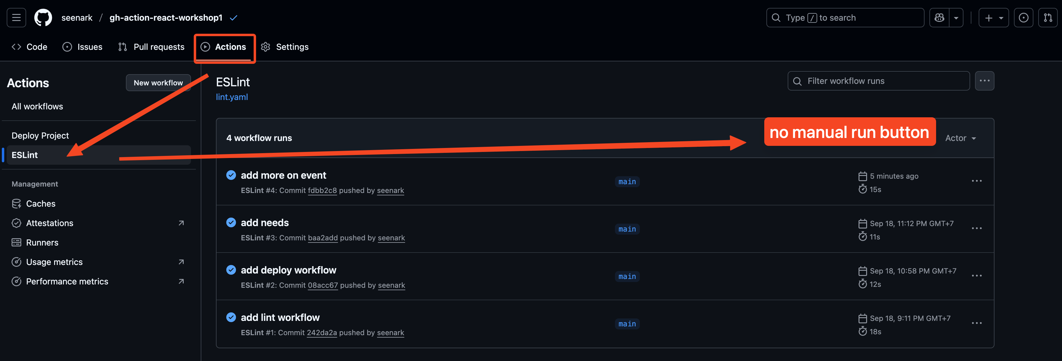 แต่พอมาดู lint workflow จะไม่มีปุ่มให้เรากด Run แบบ manual