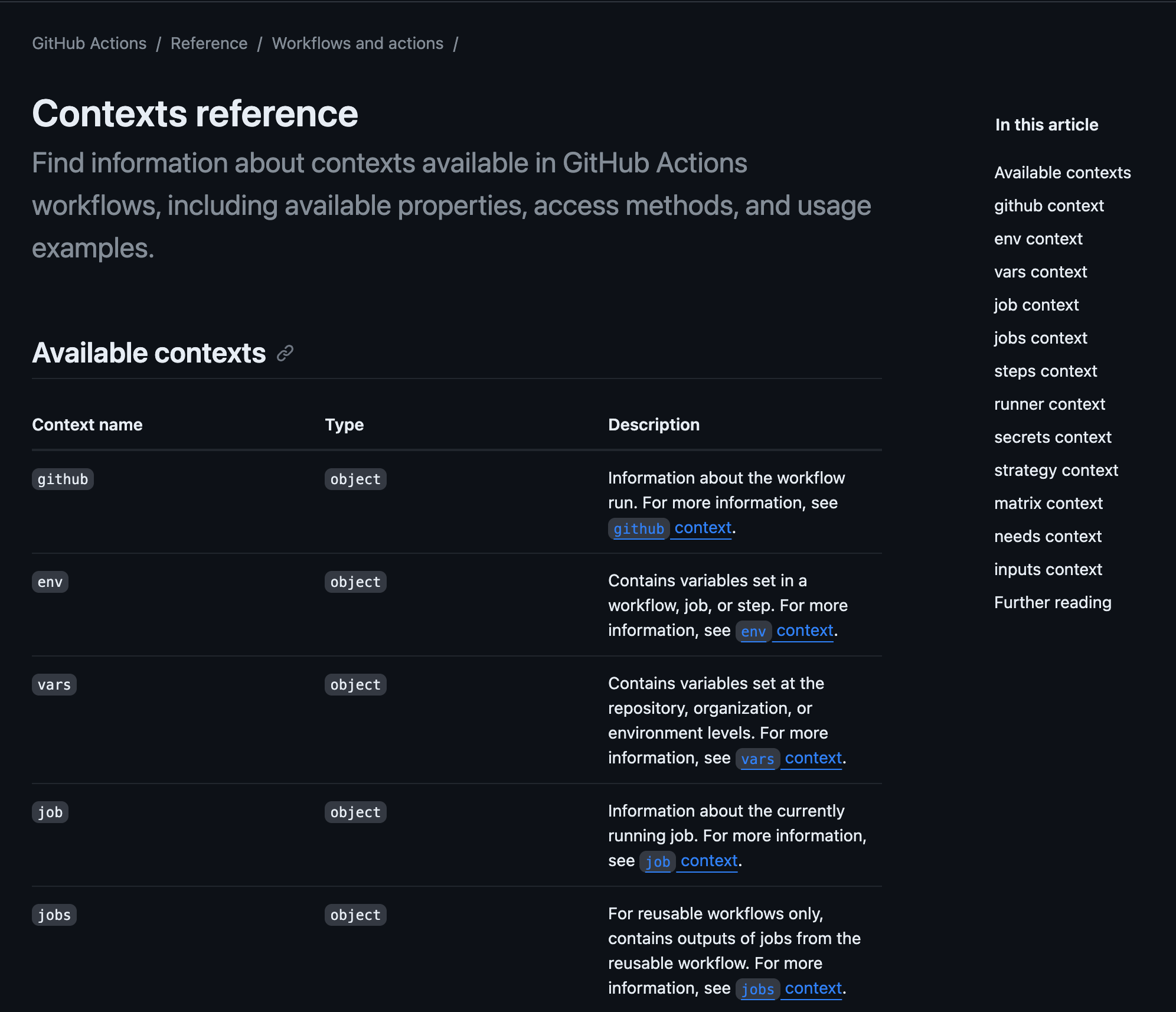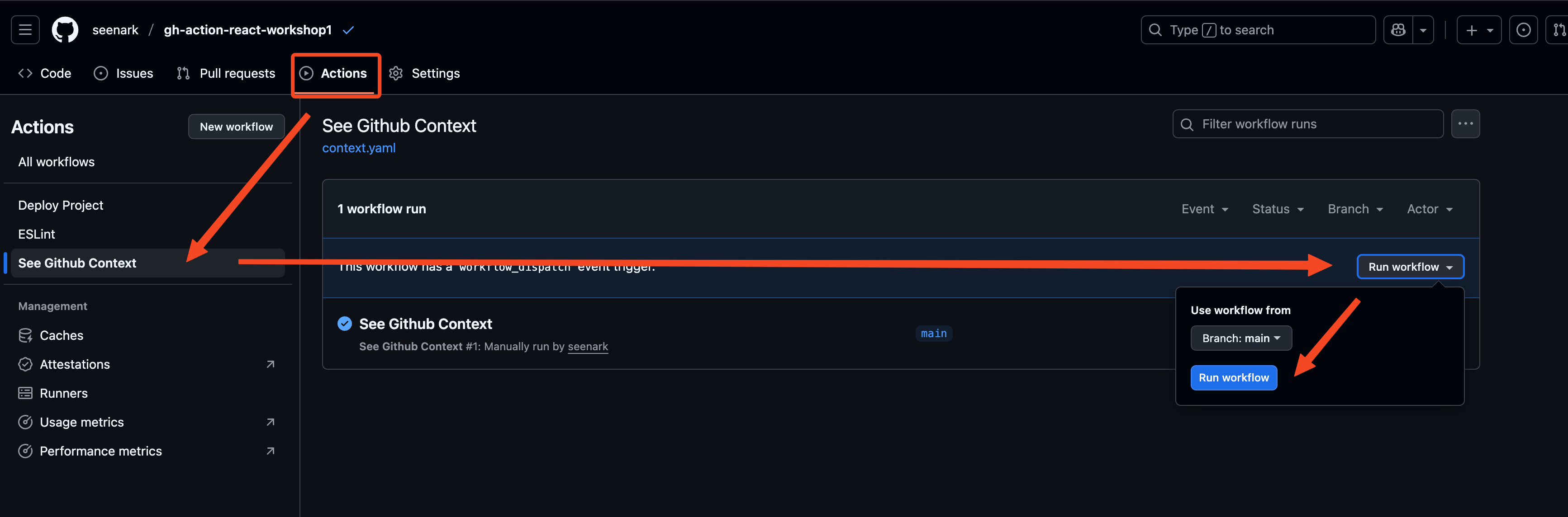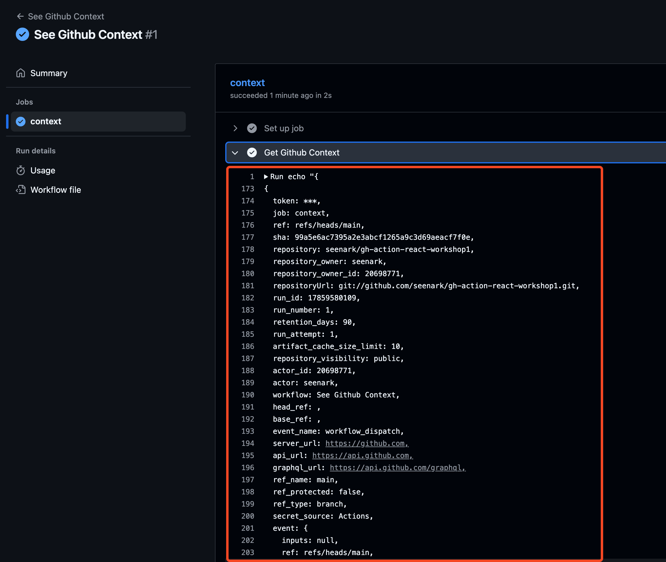 name: See Github Contexton: workflow_dispatch:jobs: context: runs-on: ubuntu-latest steps: - name: Get Github Context run: echo "${{ toJSON(github) }}"