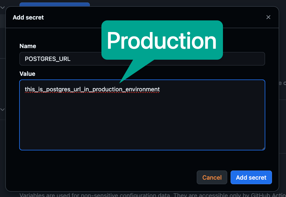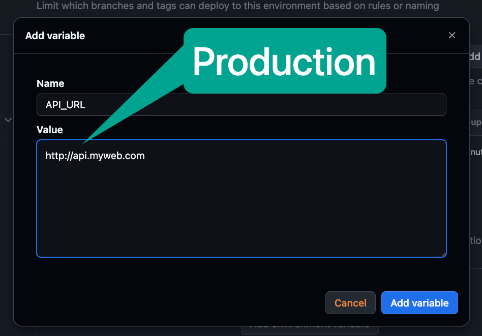 ถ้าเรามี Server สำหรับ Production เราก็อาจจะมี Secrets, Variables สำหรับ Server Productions เวลา Github actions ทำงานก็จะใช้ Variables และ Secrets ของ Environment Production มาใช้