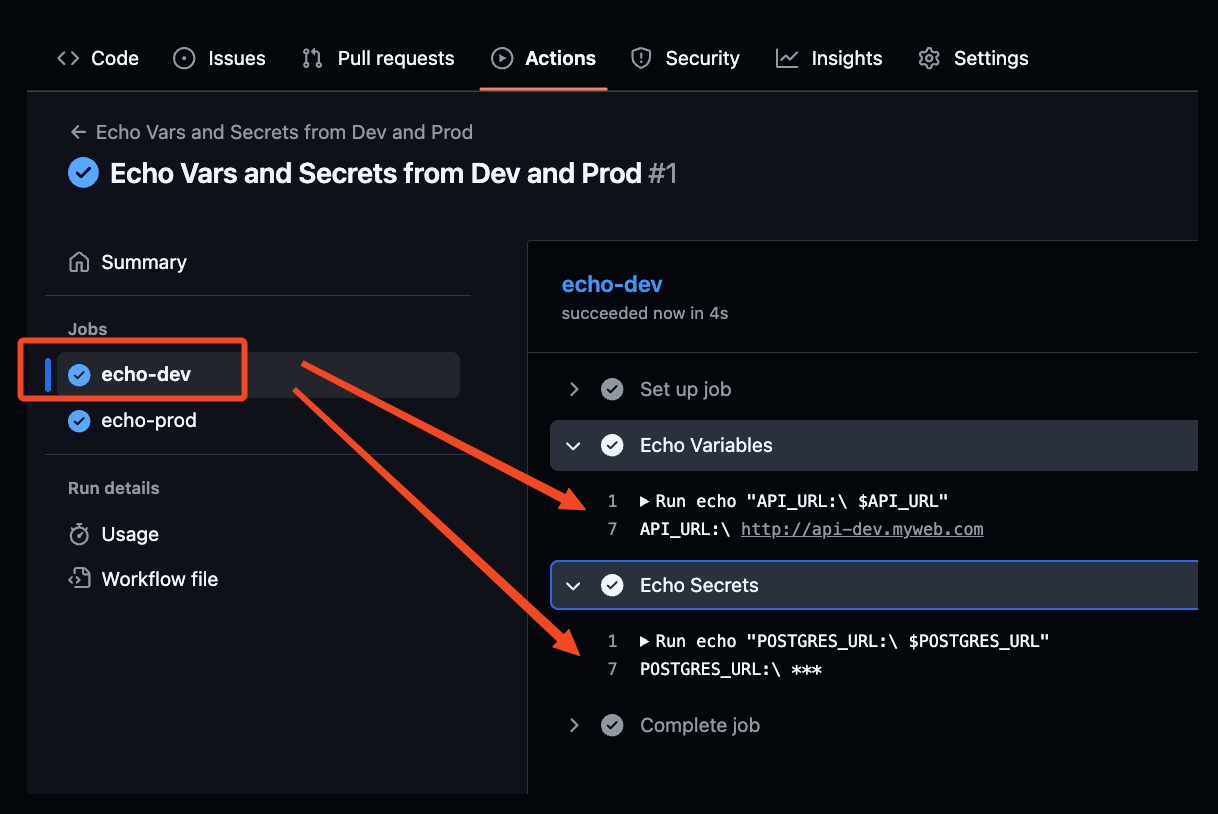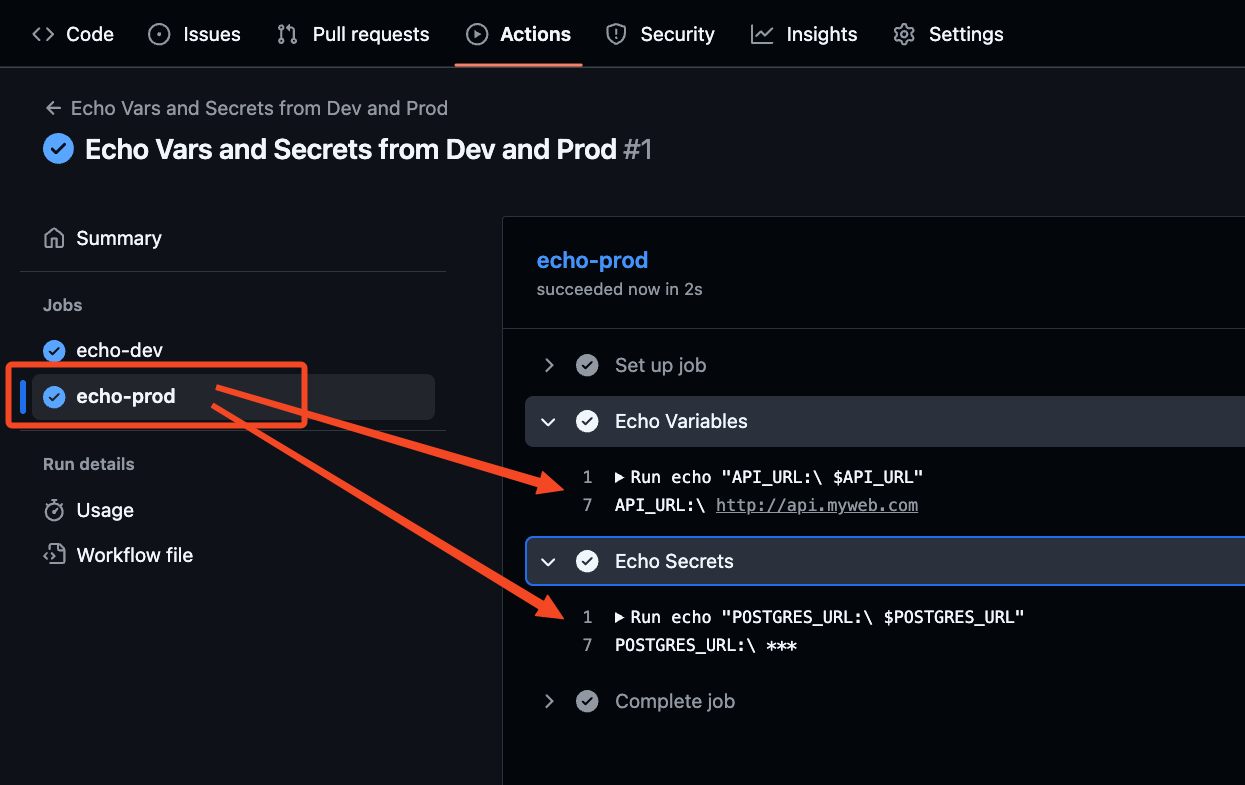 steps: - name: Echo Variables run: echo "API_URL:\ $API_URL" - name: Echo Secrets run: echo "POSTGRES_URL:\ $POSTGRES_URL"