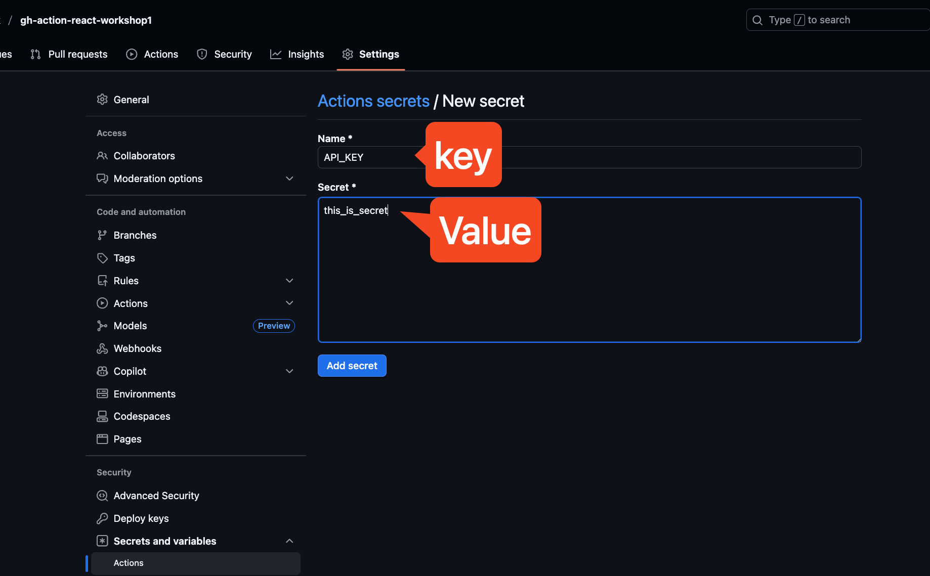 ส่วนของ Secrets ก็ทดลองใส่ API_KEY แบบหลอกๆไปก่อน