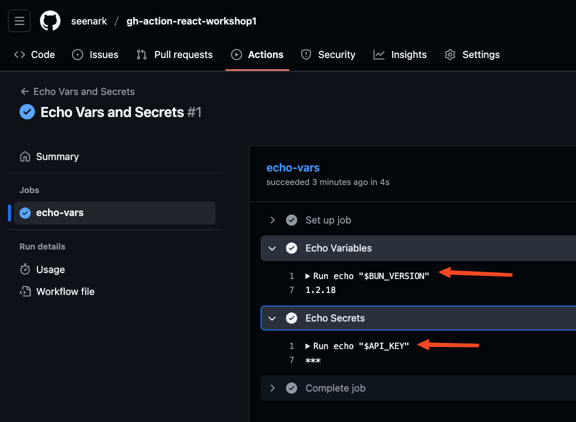 name: Echo Vars and Secretson: workflow_dispatch:jobs: echo-vars: runs-on: ubuntu-latest env: API_KEY: ${{ secrets.API_KEY }} BUN_VERSION: ${{ vars.BUN_VERSION }}